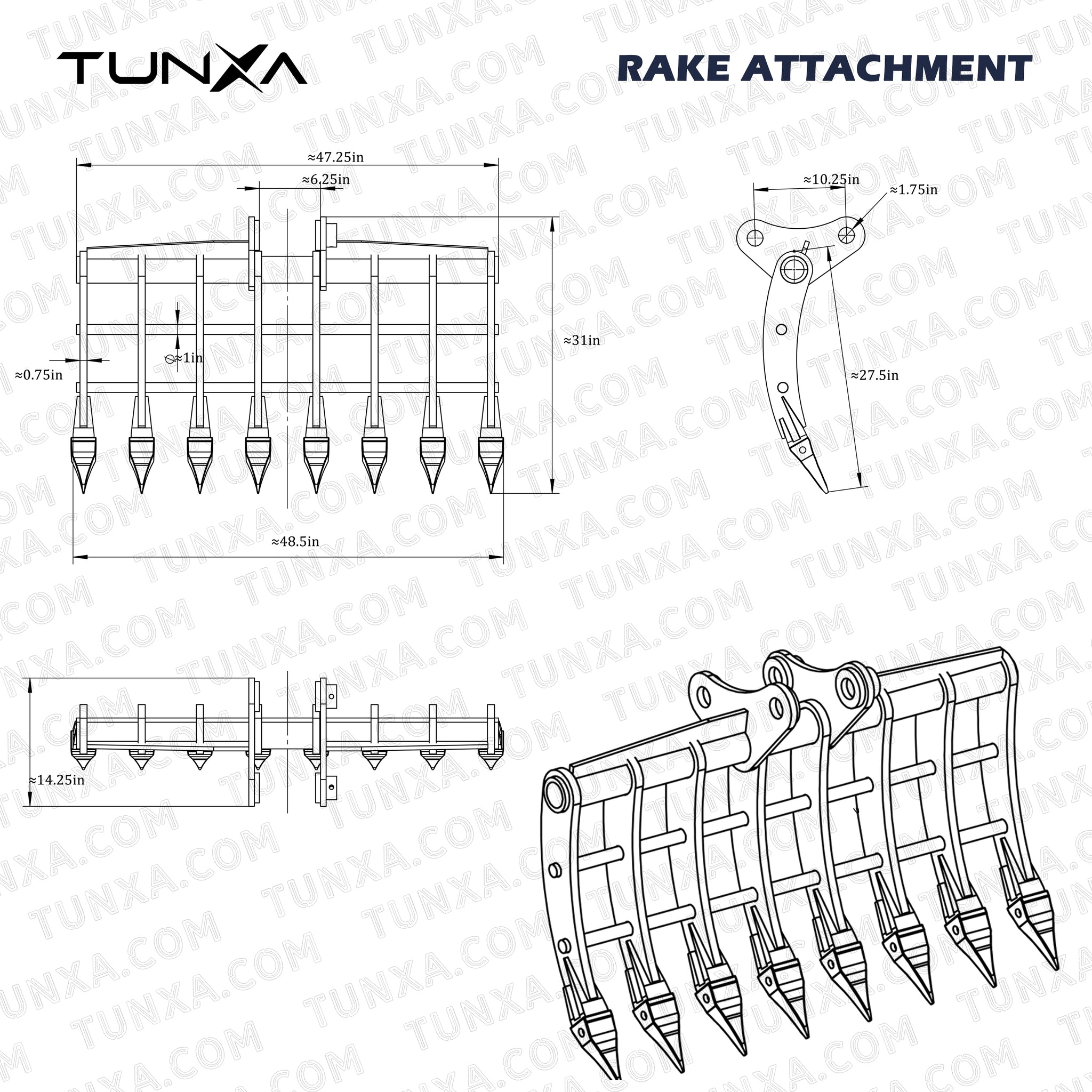 This heavy-duty rake attachment is built for 10,000-15,000 lb (approx. 5-ton) class excavators. It is suitable for larger-scale site development, mine reclamation, riverbed cleaning, and subgrade preparation in road construction. The powerful excavator paired with the wide rake body allows for rapid processing of large land areas. We offer personalized customization services. If your required attachment dimensions differ from these standard specs, contact us before ordering for a tailor-made solution based on your excavator model.